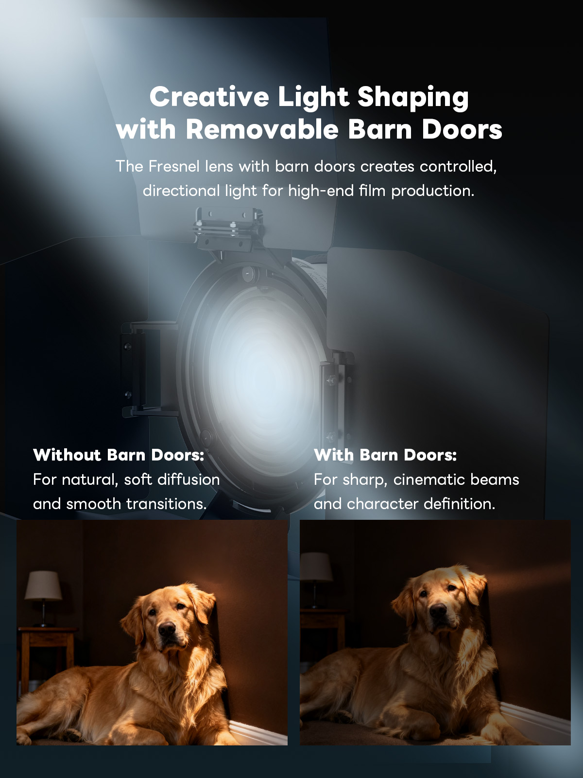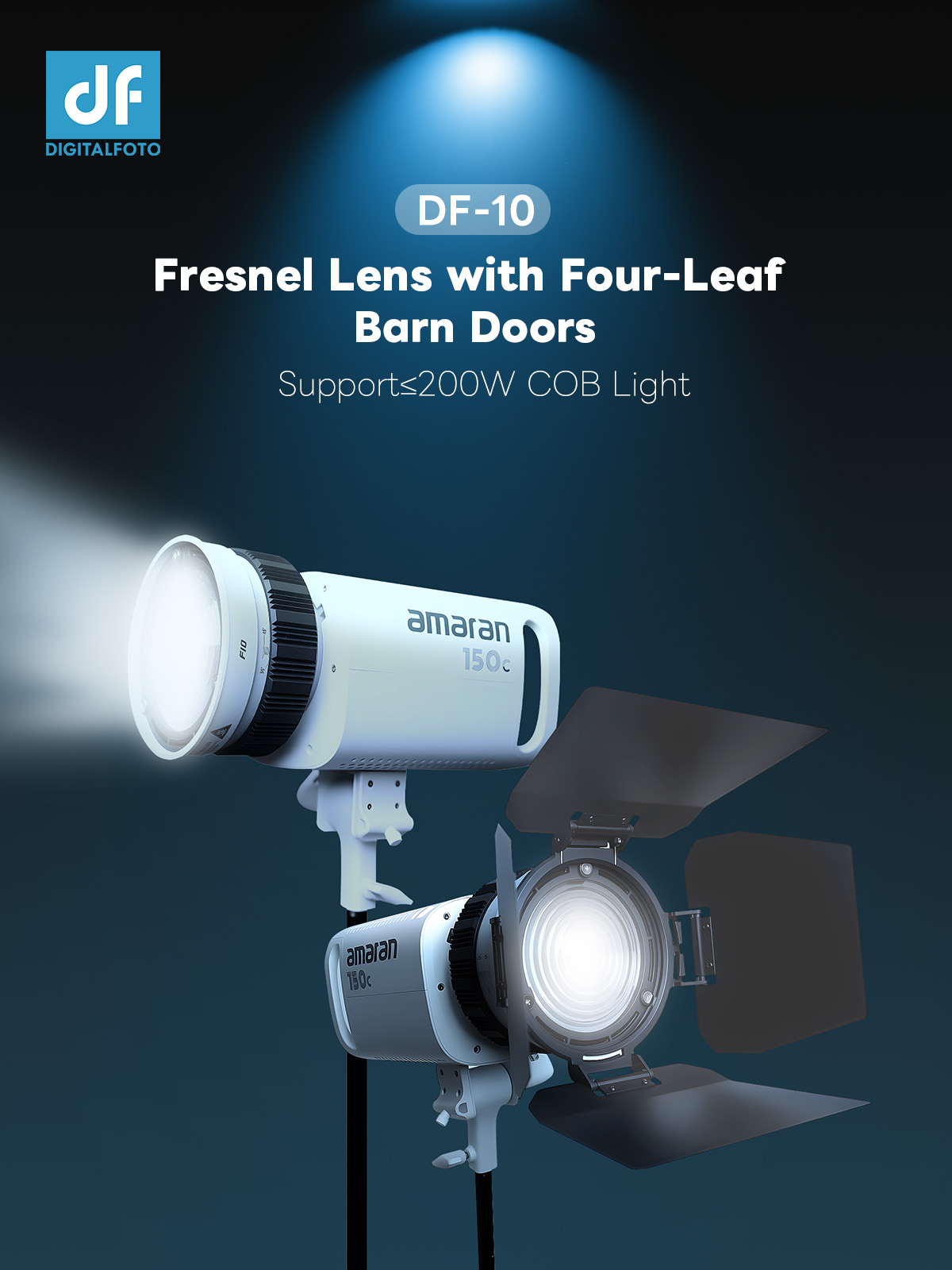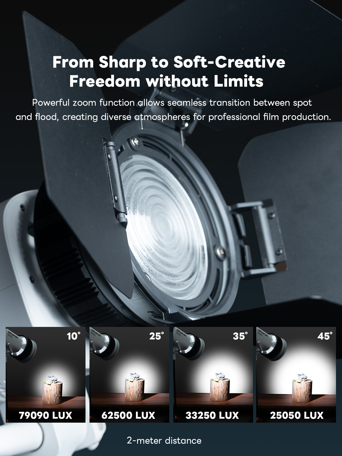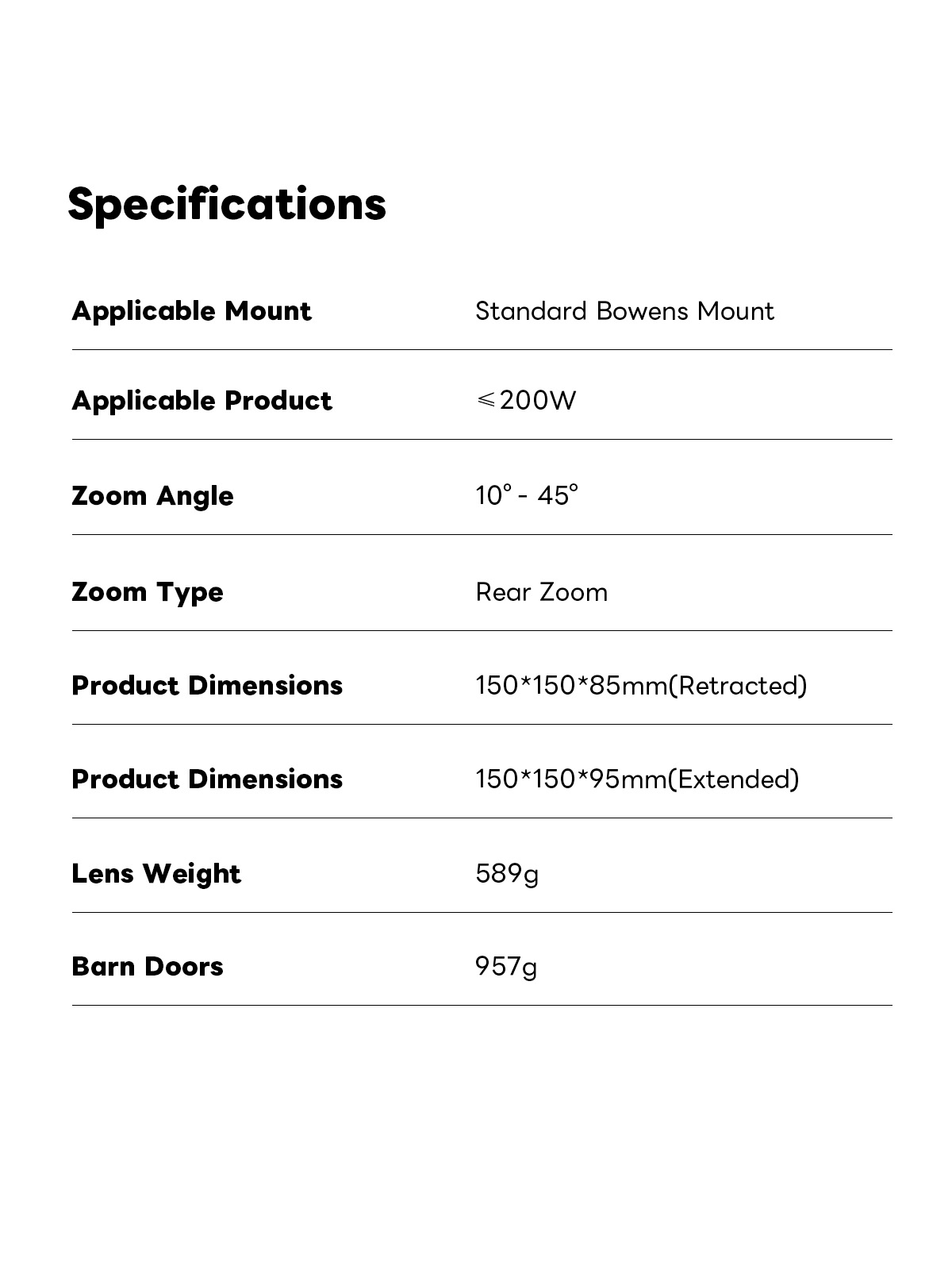 10 Times Brightening 10°-45° Focusable Fresnel Lens with 4 Leaves Barndoor Support≤200W COB Light