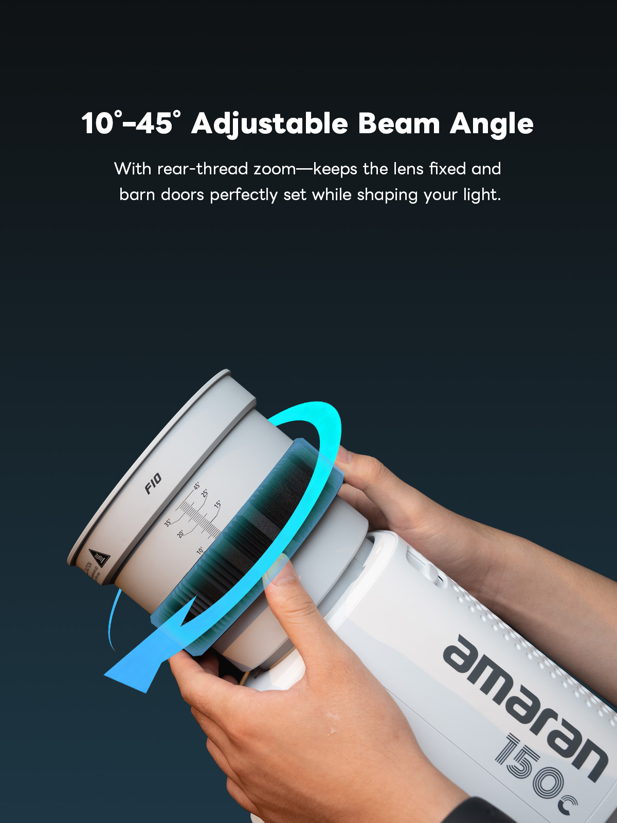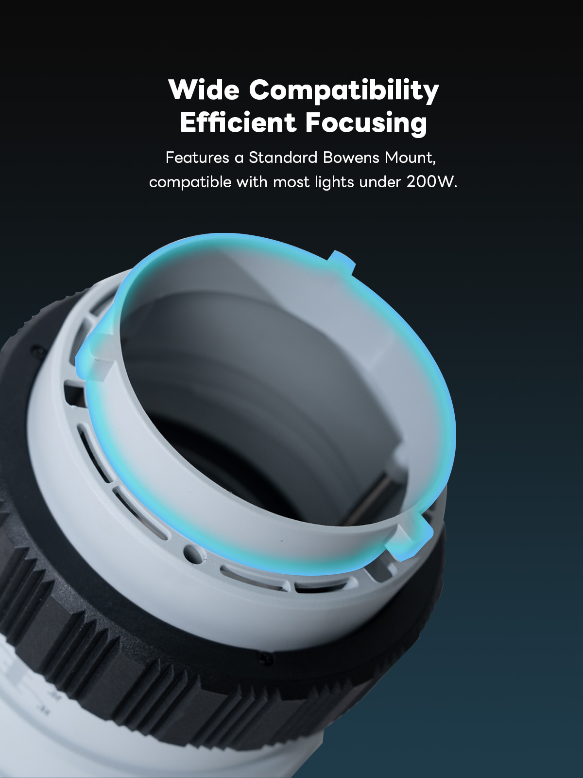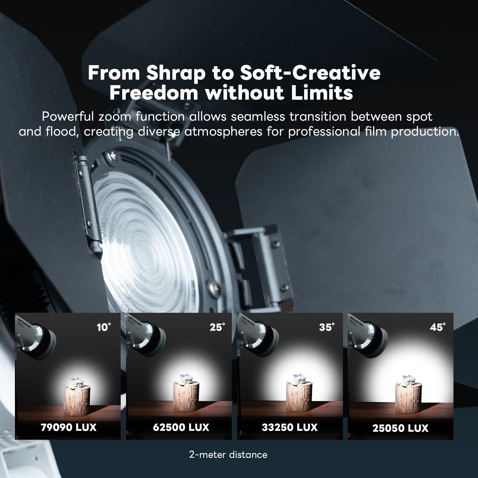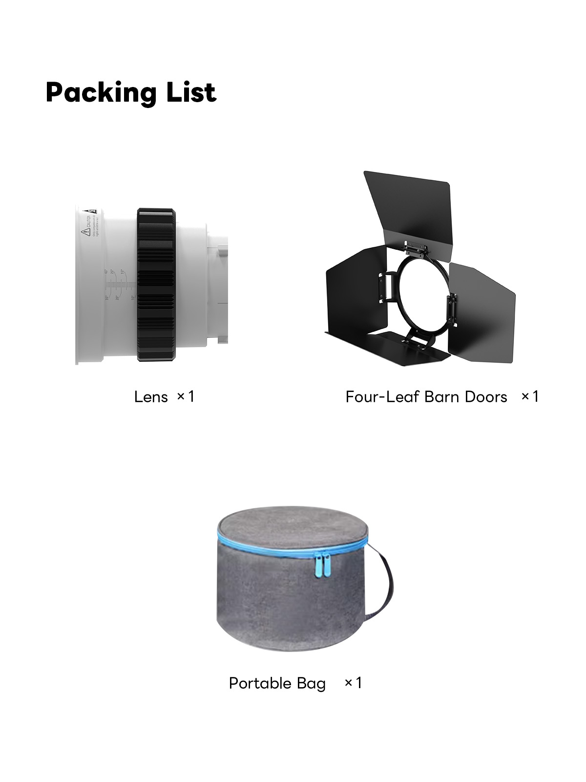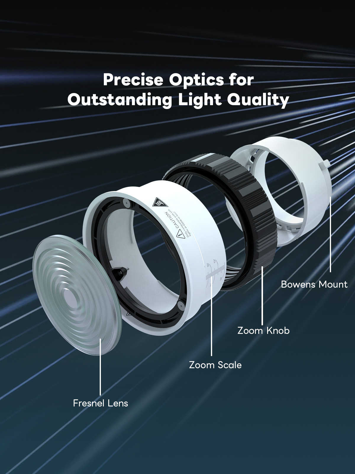 10 Times Brightening 10°-45° Focusable Fresnel Lens with 4 Leaves Barndoor Support≤200W COB Light