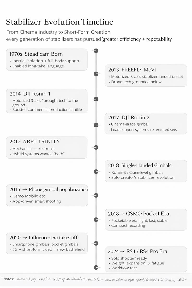 Over the last 50 years, the “main character” has changed again and again: Steadicam, motorized 3-axis gimbals, hybrid systems, phone gimbals, pocket gimbals… Each era promised the same thing: “more stable, lighter, faster.”